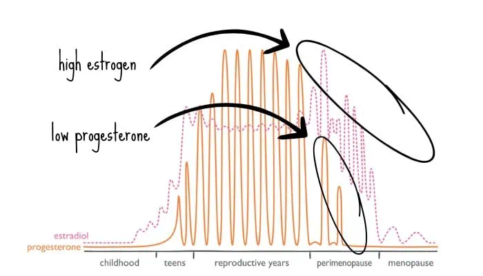 - In perimenopause, oestrogen is often high and unstable because the ovaries still make hormones.